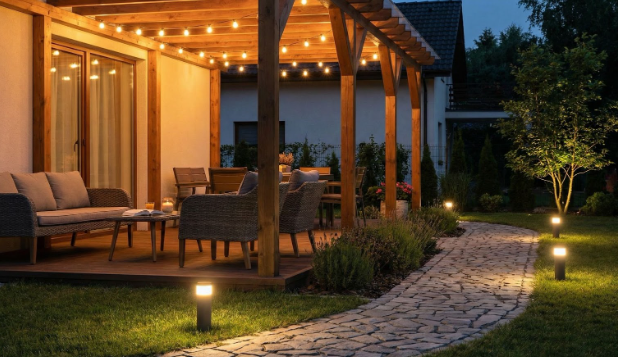 Sukurkite jaukią atmosferą terasoje sluoksniuodami šviesą